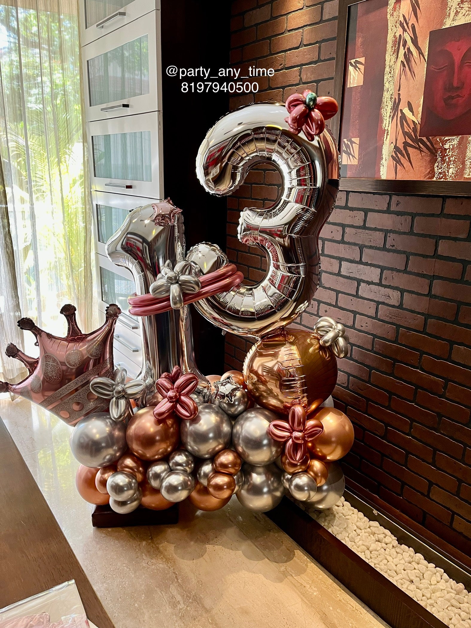 - Number 13: Large, metallic silver number "13" balloons form the centerpiece of the arrangement.