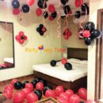 - Balloons: Red and black balloons are scattered throughout the room, creating a festive and romantic atmosphere.
